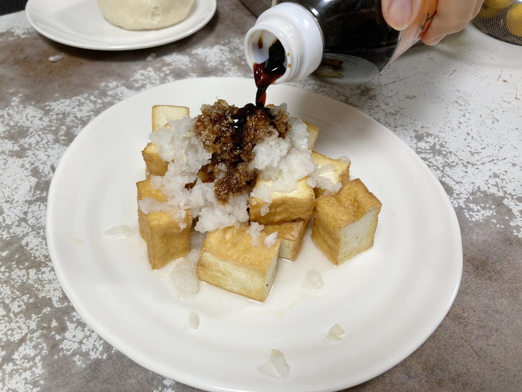 これはただ焼いた厚揚げに大根おろしと醤油をかけたものです。この厚揚げは、豆腐がしっかりしていて食べ応えがあるのでおすすめです。