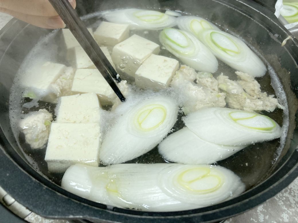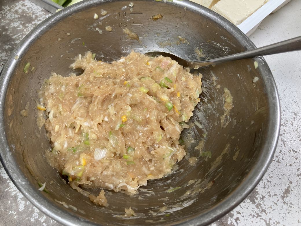 鶏つみれです。手作りしても簡単で美味しくて良いですね。ネギ、ゆず、ショウガと片栗粉、塩、しょうゆを入れて適当に混ぜただけのものです。