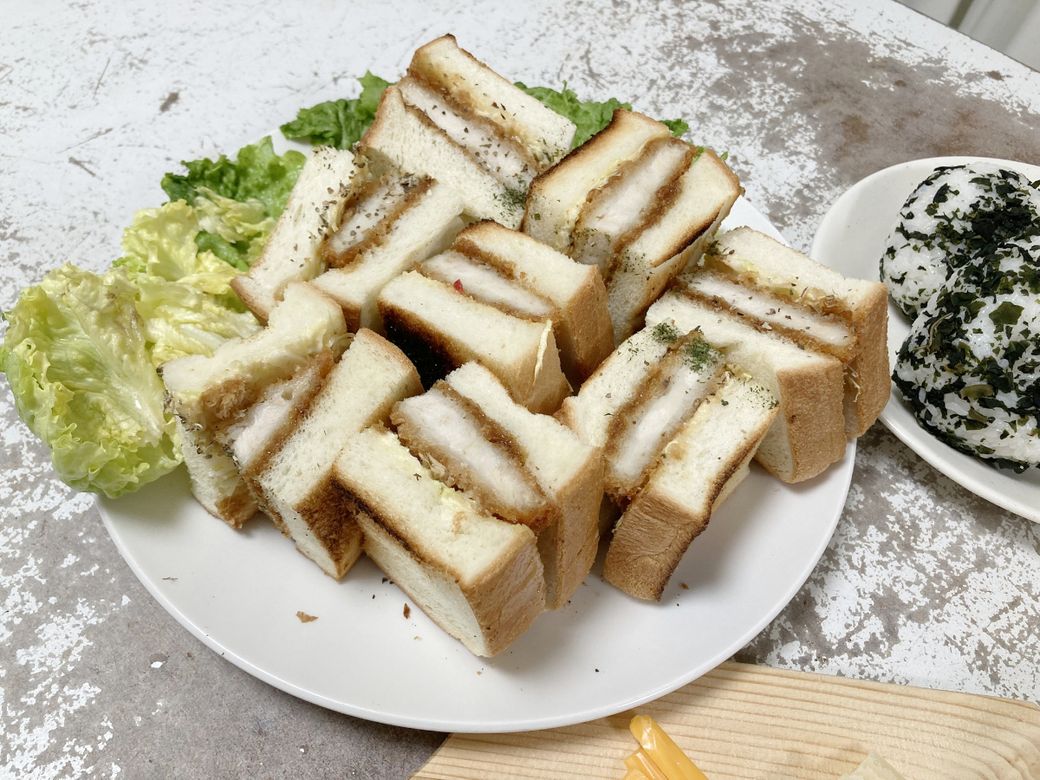 チキンカツサンド。そのままじゃ、寂しいので食べやすいサイズにカットしてトーストしました。冷蔵庫に残っていたレタスを添えて、パーティー感をだしています。 後述するミートソースをつけると、とっても美味しい。