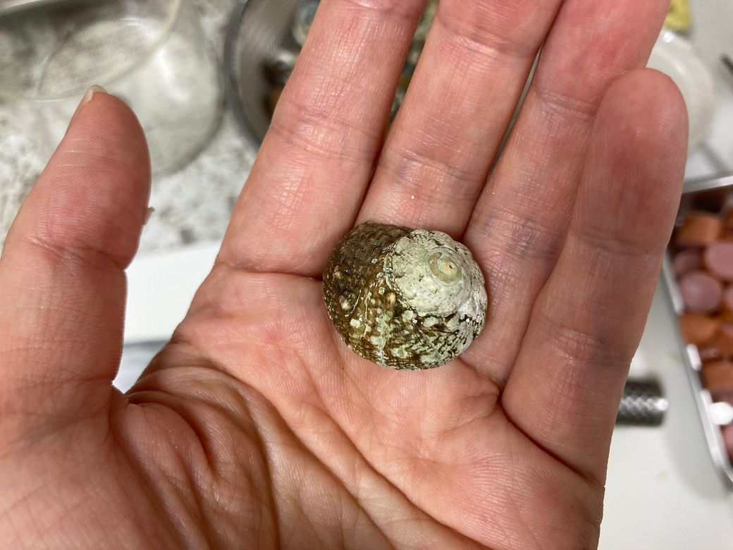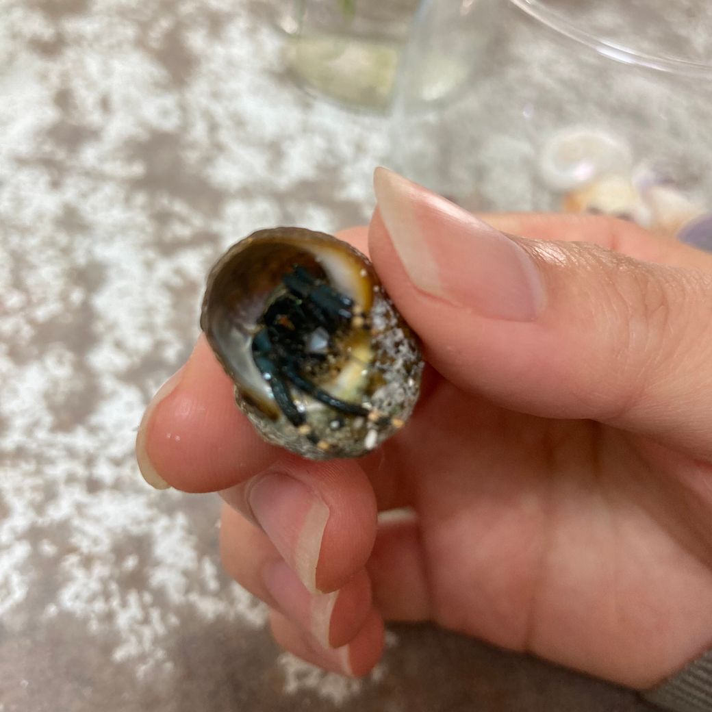 貝に混ざってヤドカリがいました。かわいいのでしばらく眺めた後、元の磯へ帰してあげました。