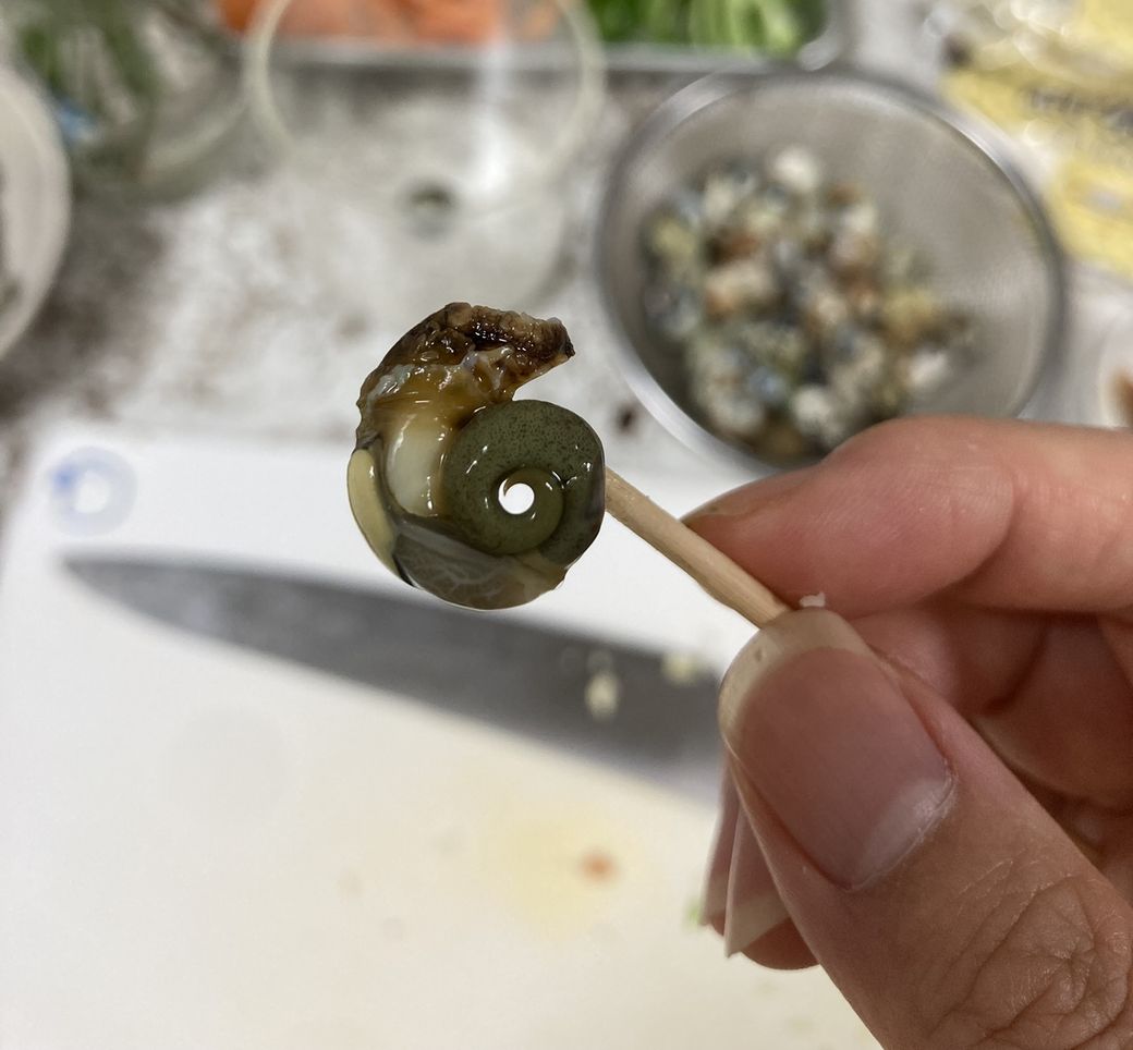 見た目はサザエより平べったいのですが、中身はサザエそっくり。